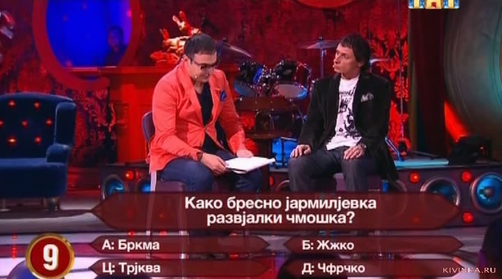 Добро вече, драги, сербское телевидение, в эфире интеллектуальная викторинко "Кто хоче жити роскошно". У нас в гостях играет 42-летний инженер-механик из Балграду Драгослав Бельнович. Вопрос на пять тысячов динаров: Кто является наиважнейшим хэроком на сказку "Златовый ключик"? (Древесино, Дупловино, Бураветко или Бурасучко). Кто главная любовь Дартаньянко? (Констанция, Квитанция, Подстанция или Ст. Бабушкинска). И самый сложный вопрос на миллион динаров: Како бресно ярмилевка развалки чмошка? (Бркма, Жжжко, Трква или Чфрчко)