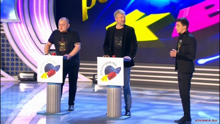 Валдис Пельш на сцене играет в игру "Кто лучше знает КВН" и бокс с негром.