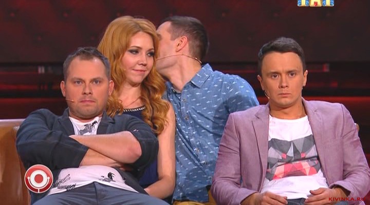 Василий Ровенский и С.Светлаков показывающий лицо в камеру и закрывающий Полину у которой всё потекло;