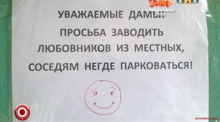 Уважаемые дамы! Просьба заводить любовников из местных, соседям негде парковаться!