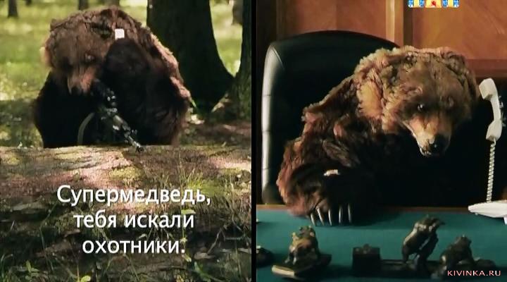 Супер-медведь, двое охотников в лесу охотятся на медведя убийцу. Когда медведь устранил охотников, позвонил на базу и доложил.