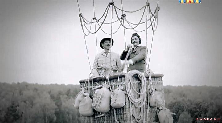 Черно-белое немое кино. Двое чудиков решили на воздушном шаре обогнуть мир и начали выбрасывать лишний вес в погоне за соперниками. Выкинули все, потом начали отрезать себе ноги, чтобы облегчить вес. Но оказалось что просто забыли отвязать трос.